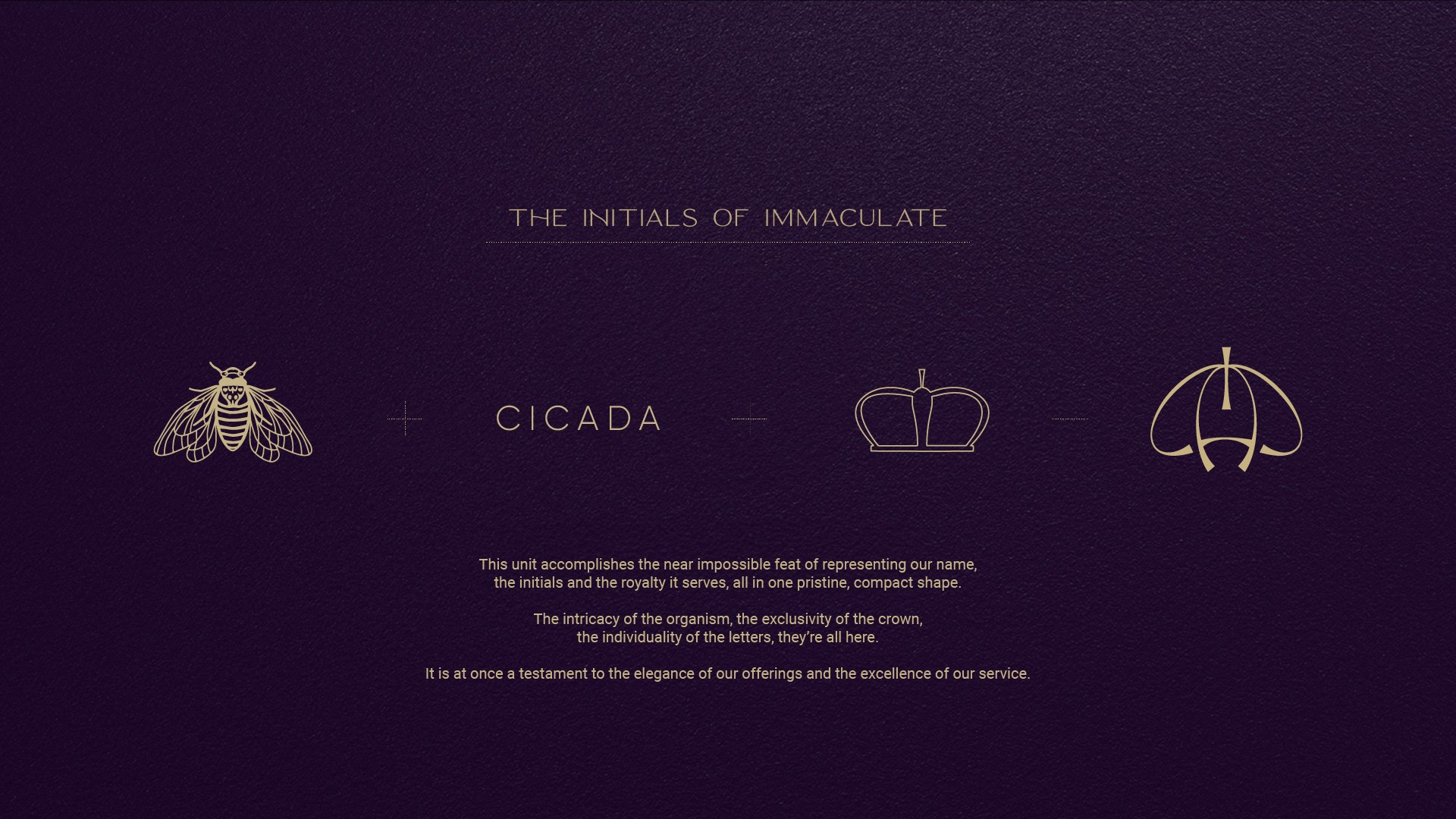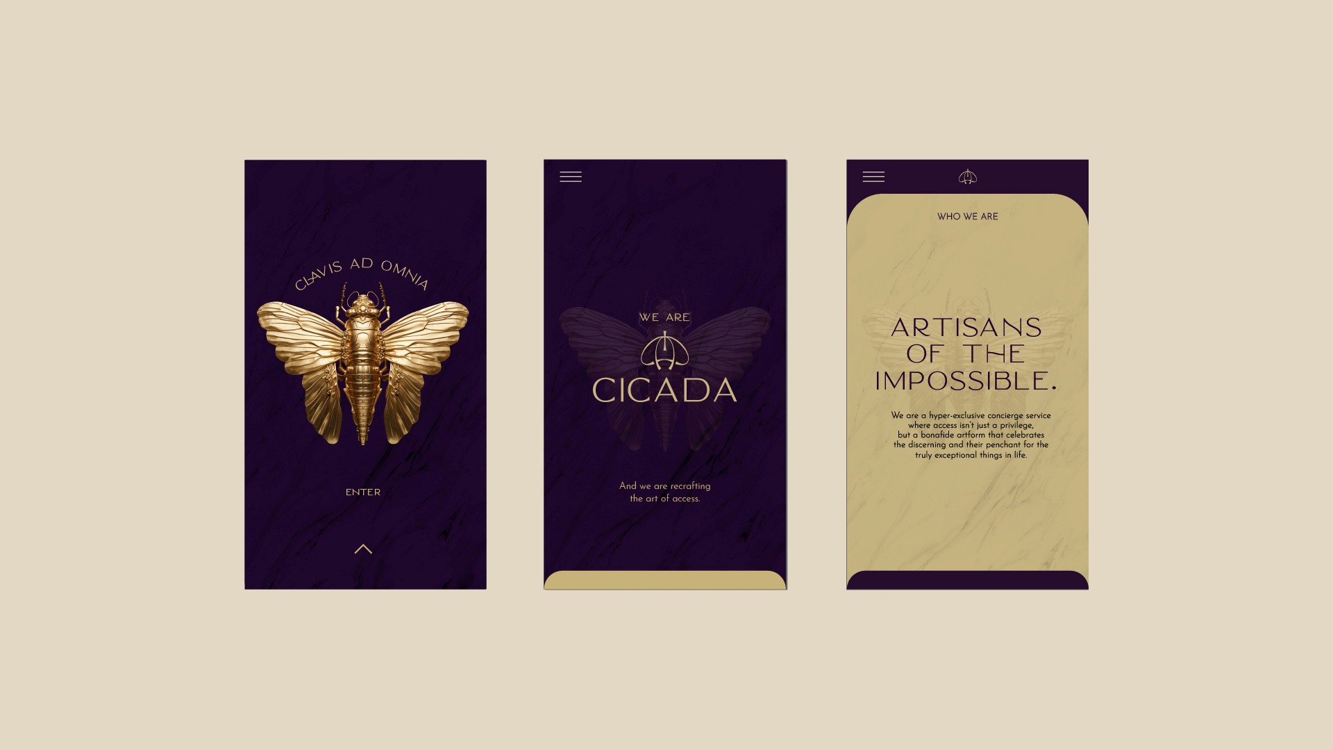 CICADA, A PRIVATE LUXURY CONCIERGE SERVICE, NEEDED AN IDENTITY THAT FELT AS RARE AND DISCREET AS THE EXPERIENCES IT PROMISES. THE ONLY MANDATE FROM THE CLIENT: THE CICADA MUST BE PRESENT IN SOME FORM. FROM THERE, THE CHALLENGE WAS TO REINTERPRET A NATURALLY INTRICATE INSECT INTO A SYMBOL OF REFINED PRIVILEGE. WE EXPLORED MULTIPLE EXPRESSIONS OF THE CICADA’S FORM. ABSTRACT, GEOMETRIC, AND SCULPTURAL, BEFORE ARRIVING AT A MARK WHERE THE CICADA SILHOUETTE, THE BRAND NAME, AND A CROWN-LIKE EMBLEM CONVERGE. THE RESULT IS A LOGO THAT FEELS SOVEREIGN WITHOUT BEING LOUD, PAIRING SYMBOLISM WITH PRECISION. THE VISUAL LANGUAGE IS BUILT ON DEEP ROYAL PURPLES AND SCULPTED GOLD, EVOKING RARITY, POWER, AND TIMELESS LUXURY. EVERY CHOICE, FROM TYPOGRAPHY TO SPACING TO MATERIAL FINISHES- REINFORCES THE IDEA OF A BRAND THAT DOESN’T CHASE ATTENTION; IT COMMANDS IT QUIETLY. CICADA’S TONE OF VOICE FOLLOWS THE SAME PHILOSOPHY: MEASURED, INTENTIONAL, AND INHERENTLY ELITE. IT DOESN’T SPEAK OF LUXURY; IT ASSUMES IT. THE IDENTITY SYSTEM EXTENDS SEAMLESSLY ACROSS PRINT, AND DIGITAL, CREATING A WORLD OF UNSPOKEN ACCESS, ELEVATED DISCRETION, AND RARE EXPERIENCES. THIS IS A BRAND FOR THOSE WHO KNOW, AND FOR THOSE WHO NEVER NEED IT EXPLAINED.