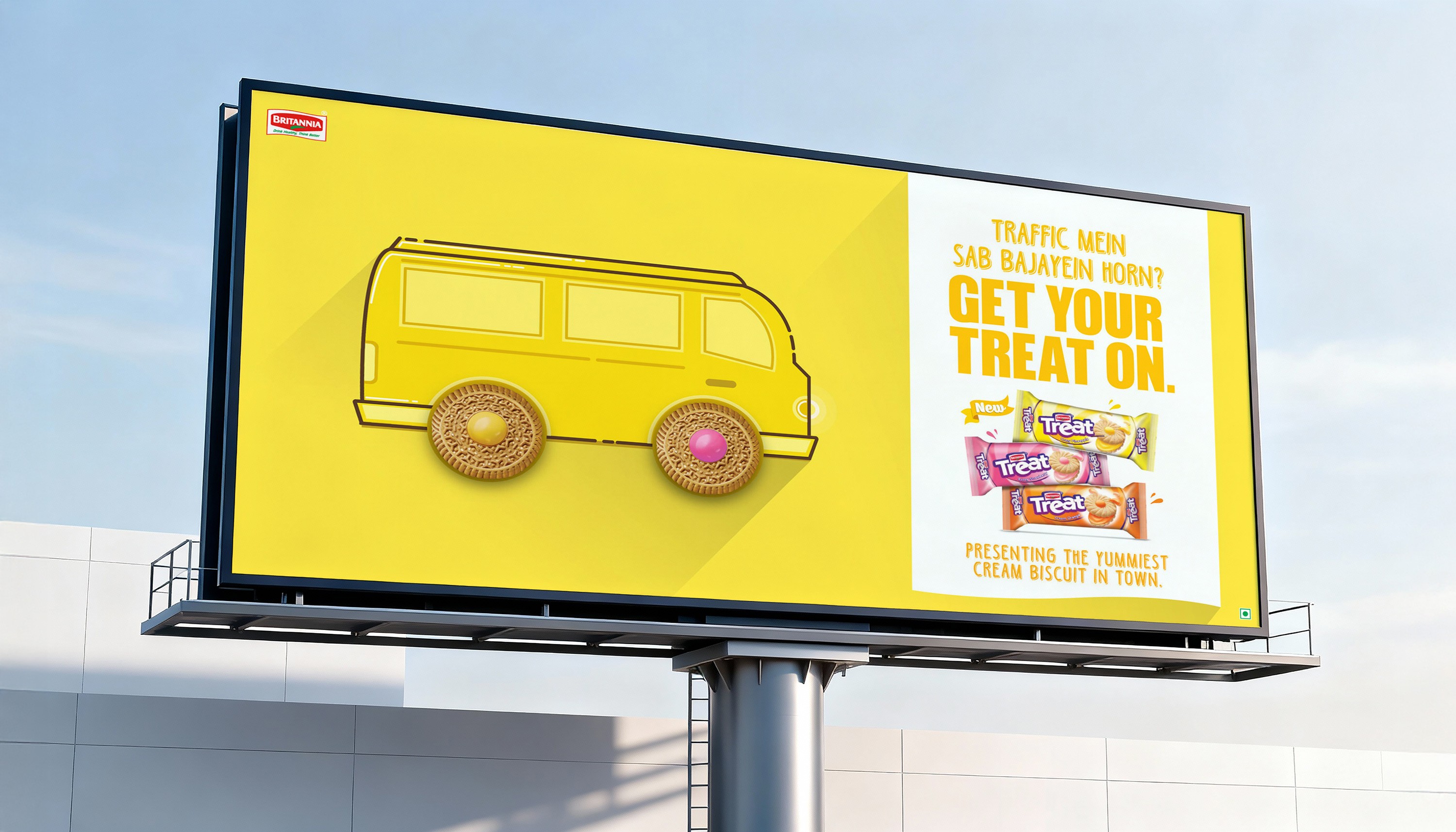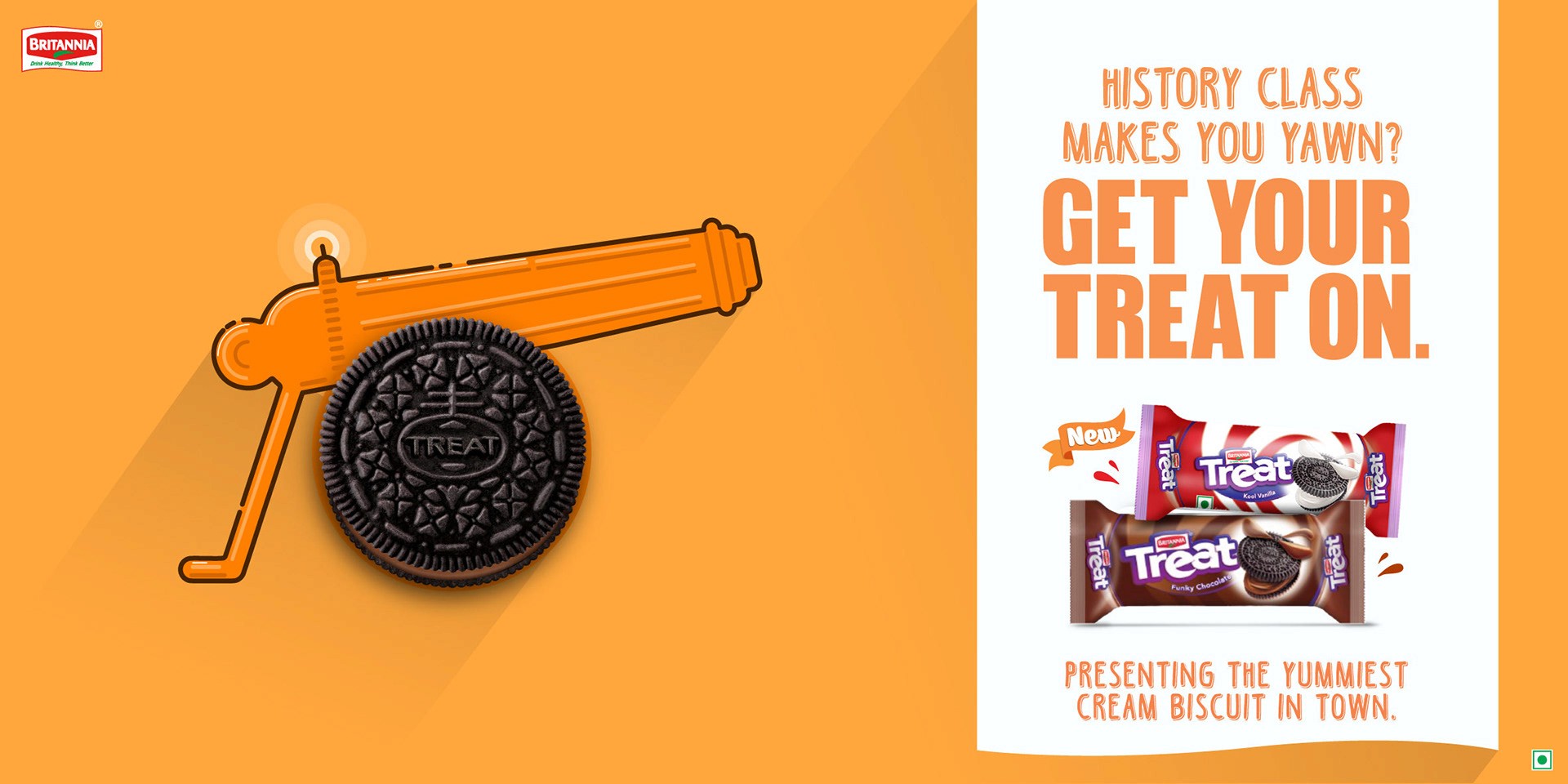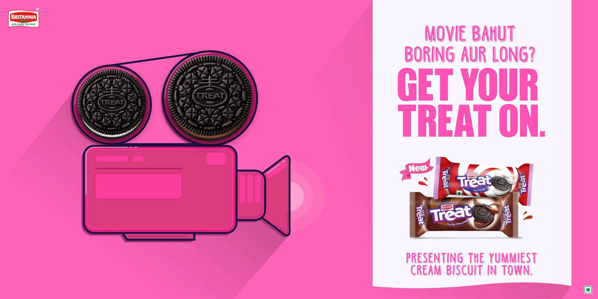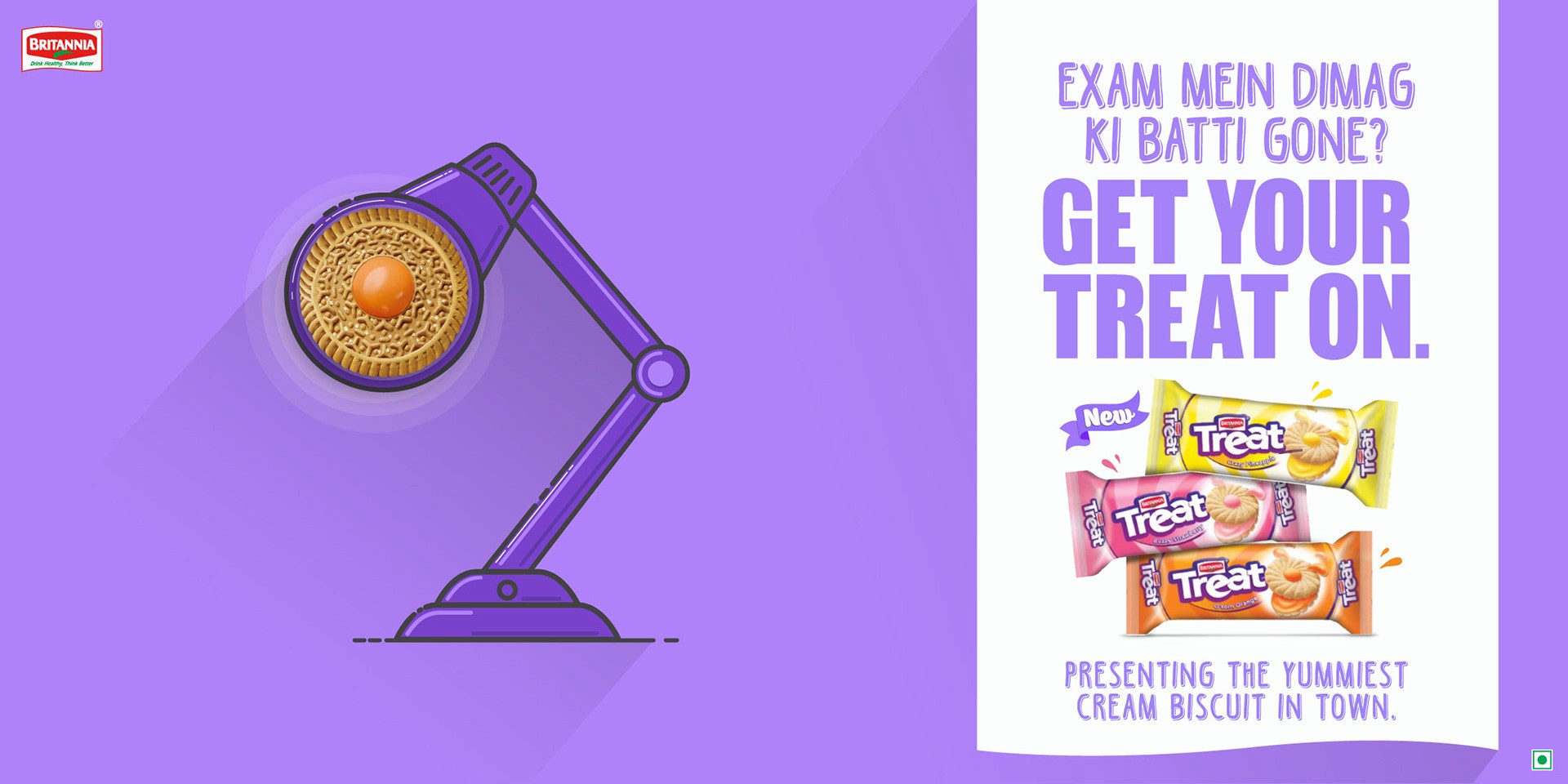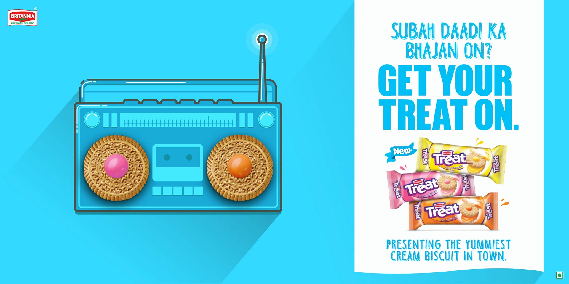 For Britannia Treat, we worked on a vibrant and youthful campaign built around the idea of adding a burst of fun to everyday moments. The visual system used real biscuits integrated into playful illustrated objects (cameras, cannons, lamps, buses, radios) to turn mundane or boring situations into instantly enjoyable ones. The bright, monochromatic backgrounds paired with bold, hand-drawn outlines created a distinctive, high-energy style that appealed directly to kids and teens. I was responsible for crafting the illustrations across the series, ensuring consistency in style, colours, shadows, and biscuit integration. The campaign line “Get Your Treat On” tied everything together, reinforcing the idea that a Treat biscuit can uplift any moment. Each visual became a quirky, delightful snapshot that highlighted the product while delivering an engaging, scroll-stopping brand presence.